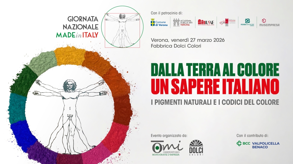 Segnaliamo l'evento in oggetto, patrocinato tra gli altri da questo Ordine, che si terrà presso la Sala convegni della fabbrica Dolci Colori (in Via Cantarane 16, Verona) venerdì 27 marzo 2026, a partire dalle ore 17,00. Il colore nei dipinti rappresenta un punto di incontro tra materia, tecnica e significato simbolico. L’evento è occasione per conoscere e visitare Dolci Colori, storica fabbrica veronese che dal 1910 è specializzata nella produzione di pigmenti ottenuti dalla lavorazione di terre e pietre naturali, apprezzati e utilizzati in tutto il mondo, ma la cui storia è ancora poco conosciuta in Italia: un emblema di patrimonio manifatturiero che intreccia territorio, cultura e Made in Italy. A seguire, la conferenza di Alberto Maria Sartori, studioso e divulgatore scientifico, propone una riflessione sull’impiego dei pigmenti naturali nella pittura italiana, con particolare riferimento all’arte sacra e alla loro valenza simbolica. L’evento è organizzato dall’Osservatorio Monografie d’Impresa APS nell’ambito della Giornata Nazionale del Made in Italy 2026. Ingresso libero previa registrazione da effettuarsi cliccando qui. Per gli Ingegneri: CFP in autocertificazione Programma 16:45 Accoglienza e registrazione 17:00 Visita guidata alla storica fabbrica Dolci Colori 17:40 Saluti istituzionali 17:50 Dolci Colori: oltre un secolo di pigmenti naturali, da Verona al mercato globale Andrea e Ilaria Dolci imprenditori e custodi della memoria famigliare 18:05 Alchimia e Devozione: il valore simbolico dei pigmenti naturali nella pittura sacra italiana Alberto Maria Sartori studioso e divulgatore scientifico 19:00 Chiusura lavori